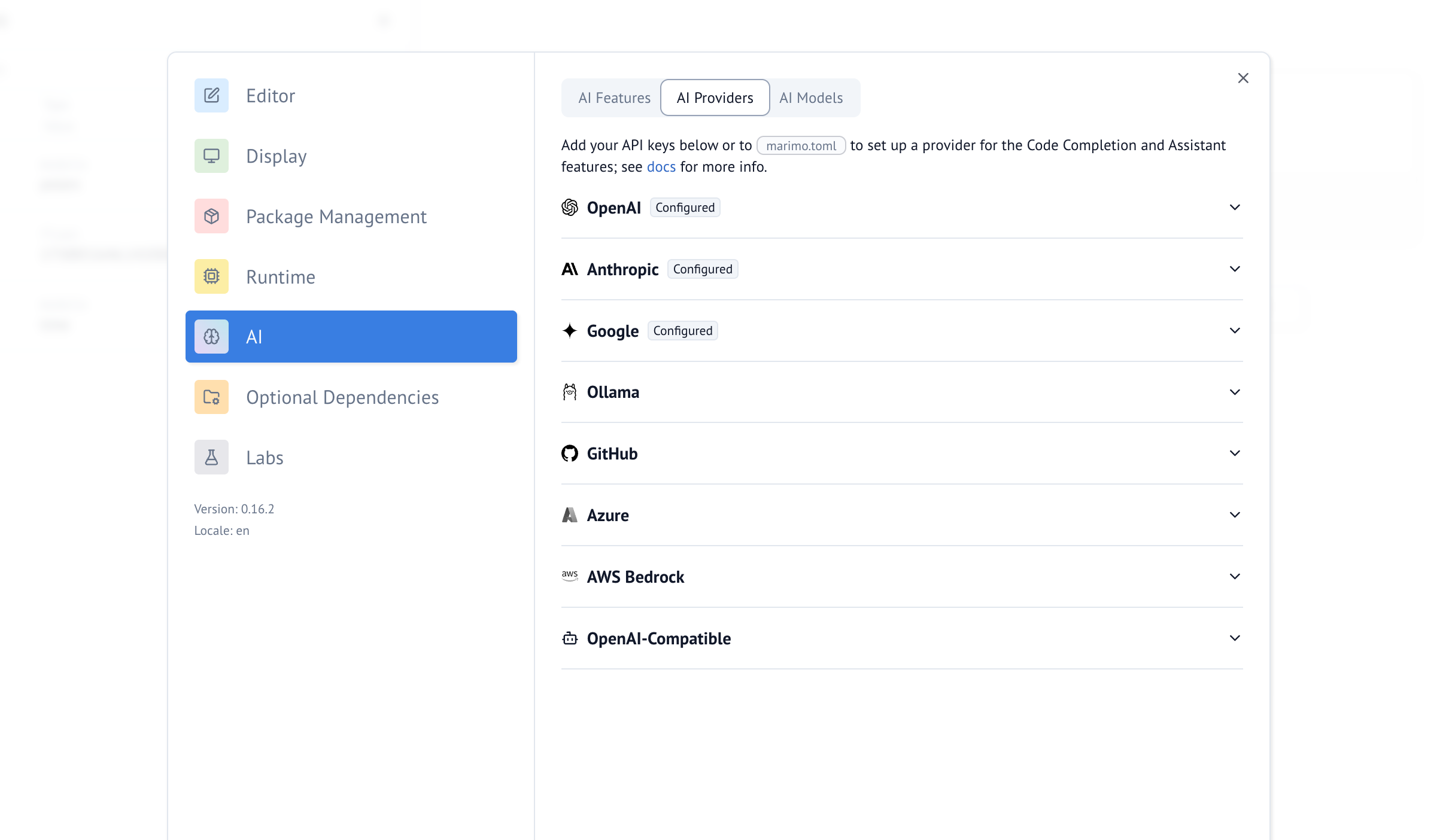 Below we describe how to connect marimo to your AI provider.